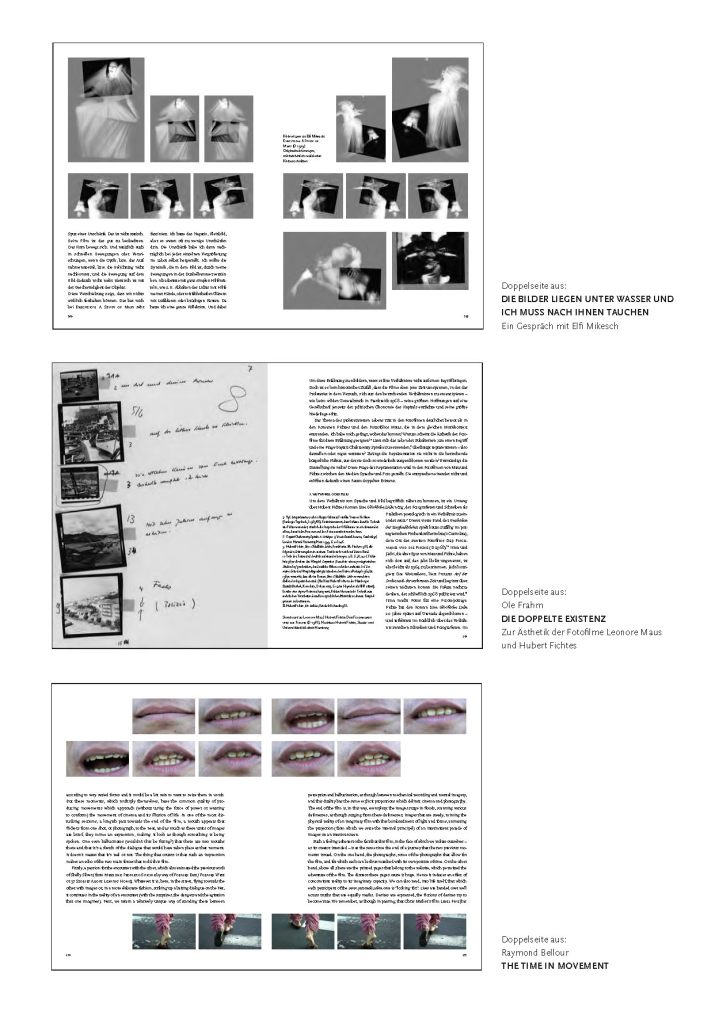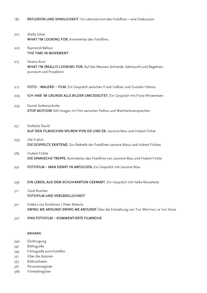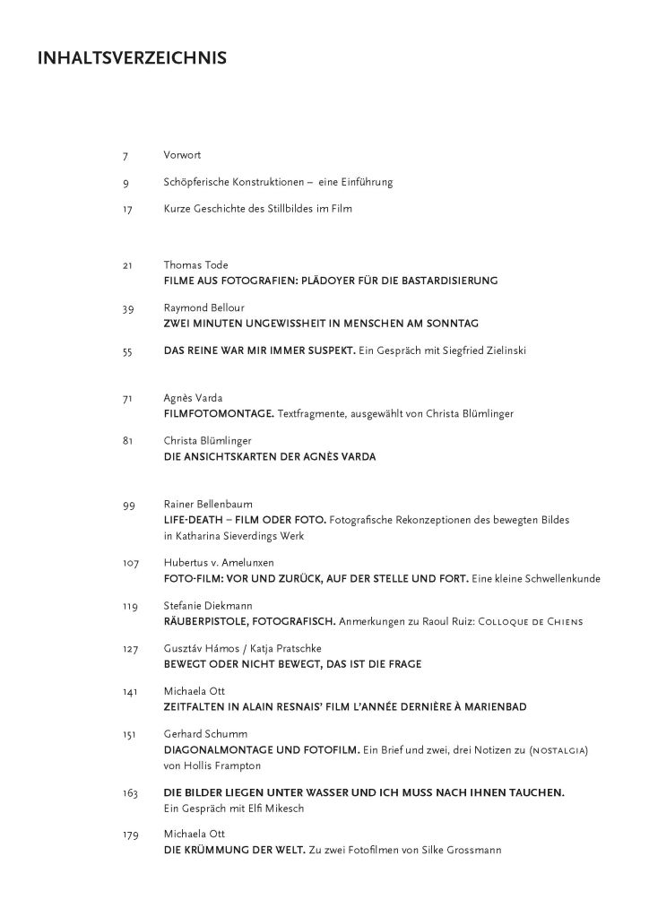Originalbeiträge von: Hubertus von Amelunxen, Raymond Bellour, Rainer Bellenbaum, Christa Blümlinger, Nathalie David, Stefanie Diekmann, Hubert Fichte, Ole Frahm, Gusztáv Hámos, Daniel Kothenschulte, Verena Kuni, Michaela Ott, Katja Pratschke, Gerd Roscher, Gerhard Schumm, Shelly Silver, Thomas Tode und Agnés Varda.
