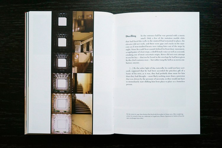 The photonovel transforms Imre Kertész’ literary method into a visual language: by joining fragmentary elements from the past and the present, by finding traces that link experience and remembering. The book with its filmic images moves the «reader» to think movement; by flicking through the book, the editing, the montage is effected through the reader’s exploration of it.